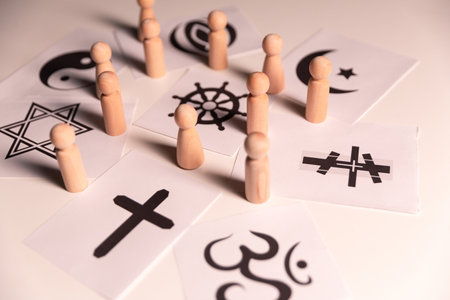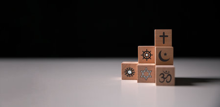 Concept of interfaith dialogue promotes understanding and spirituality by bringing together symbols, beliefs from diverse religions Hinduism, Islam, Judaism, Buddhism, faith and religious harmony.