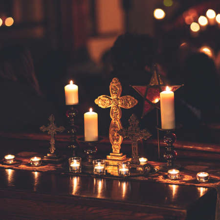 A closeup shot of lighted candles and crosses on the table