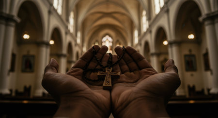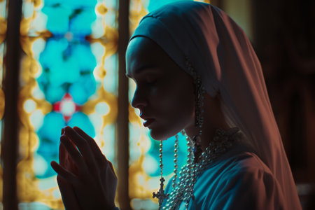 A Catholic praying in a historic church, her rosary beads glinting in the soft light filtering through stained glass.