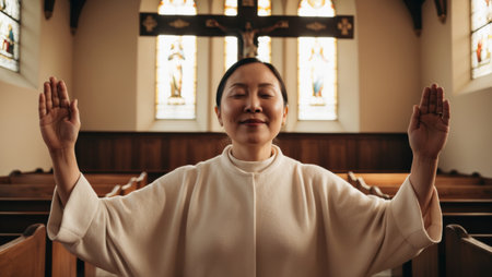 Woman wearing a white sweater is raising her hands in prayer while sitting in a church pew