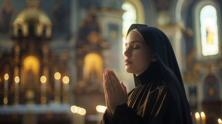A caucasian nun, wearing a black habit, is deep in prayer within a church. The portrait captures her serene expression and the devotional atmosphere.