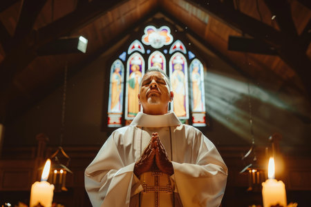 Clergyman prays devoutly in a church, rays of sunlight illuminating him through a colorful stained glass window