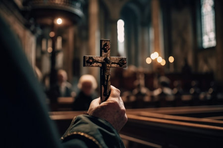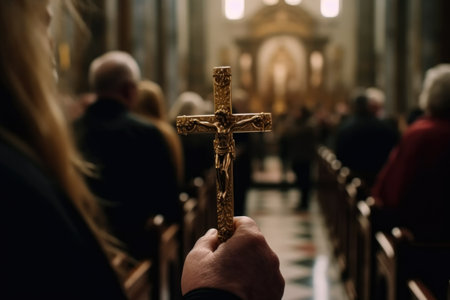 Capturing divine moments: church worship concept Christians, raised hands, earnestly pray and worship to cross in the sacred ambiance of a church building, expressing faith and spiritual connection