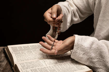 Jesus Christ praying to God with the Holy Bible and the Holy Rosary in the hands in the dark black night