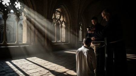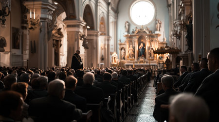 During an evening service, a priest performs the sacred Eucharist ceremony at a richly adorned church filled with warmth and reverence