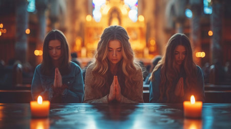 Warm candlelight illuminates the golden altar and stained glass windows of a church, creating a spiritual atmosphere. Ai generative