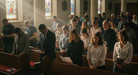 Congregation in Silent Prayer Inside Sunlit Church with Stained Glass Windows