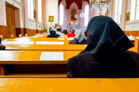 Female believers are praying with their priest at Sunday morning in old and small Catholic Church.