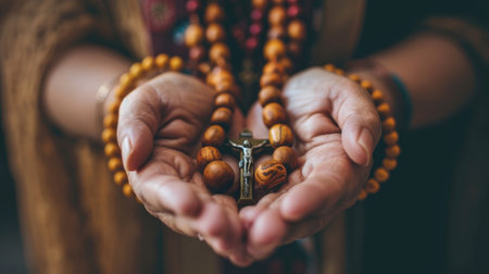 Weathered hands hold a crucifix rosary tightly, a profound symbol of faith and prayer. True to his religion. Hands holding a Rosary in prayer.