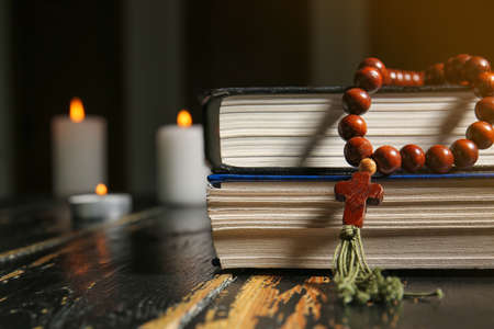 Rosary beads with cross on Bible book. Faith and prayer concept