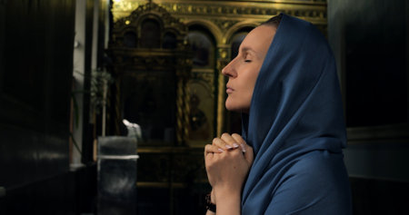 Woman prays in temple. Close-up of praying woman with closed eyes and clasped hands in traditional church. Holy setting emphasizes devotion and inner connection to faith. Concept of Christianity