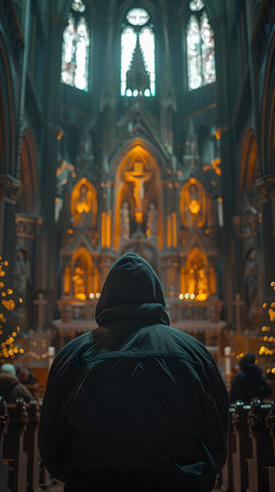 Devout Prayer in Church, Gaze on Crucifix, Candlelight Surroundings.