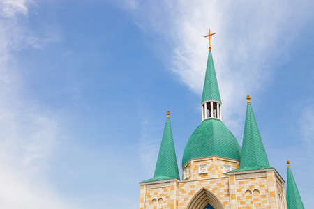 Christian church cross in high steeple tower for prayer, photography consisting of beautiful church with cross on steeple tower to sincere prayer, cross steeple tower is church over clear sky