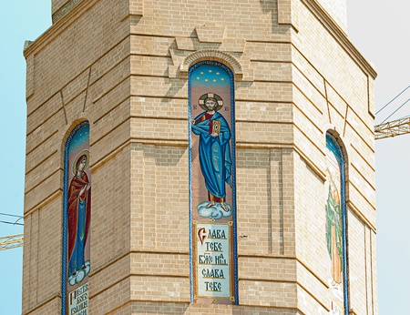 Colorful mosaic on the facade wall of the Cathedral of the Archangel Gabriel which is under construction. Odessa. Ukraine.