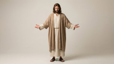 A man with long hair and a beard, dressed as Jesus Christ in historical robes, stands with his arms outstretched in a welcoming gesture against a plain background.