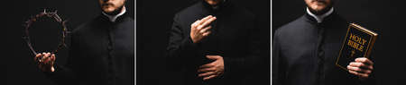 collage of priest holding holy bible and wreath with spikes while praying isolated on black