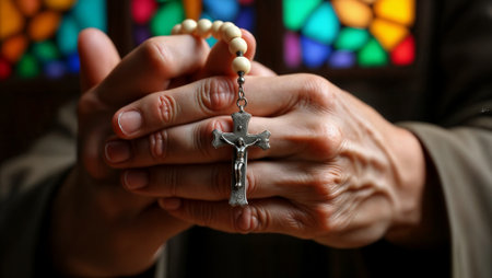 Close-up of hands clasped in prayer holding white rosary beads and silver crucifix, symbolizing faith and devotion. Colorful stained glass creates a sacred atmosphere in the blurred background.