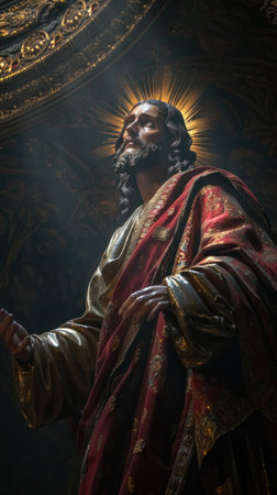 Statue of Jesus Christ in an ornate church setting. A divine figure. Concept of resurrection, hope, sacred presence, faith, spirituality, Easter, divinity, Christian beliefs, resurrection, religious. Copy space