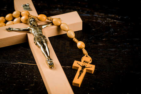 Light brown wooden cross on old boards with a rosary