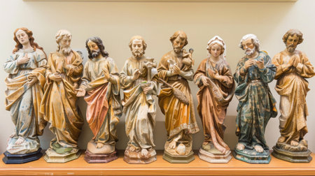 This stunning image showcases five meticulously crafted religious statues within a church setting, featuring bright colors and intricate details, celebrating faith.