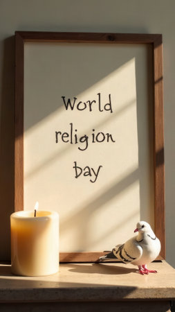 The words World religion day are written in a wooden frame at home interior with a white dove and burning candles. Holiday card. Symbol of peace, faithful and purity. Concept of international faith.
