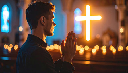 Spiritual reflection and faith symbolized by a man praying in a candle-lit church facing a glowing cross, conveying hope, inner peace and devotion.