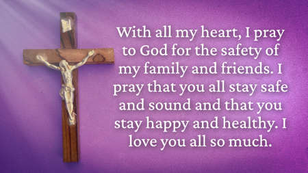 Christianity prayer on purple color cover with bright shining cross. Religious concept