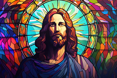 The image features stained glass art depicting Christ set in a modern church. The scene is vibrant and detailed reflecting spiritual symbolism and contemporary design elements...