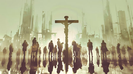 A digital painting depicting Jesus Christ on the cross amidst a crowd of people in a futuristic cityscape.