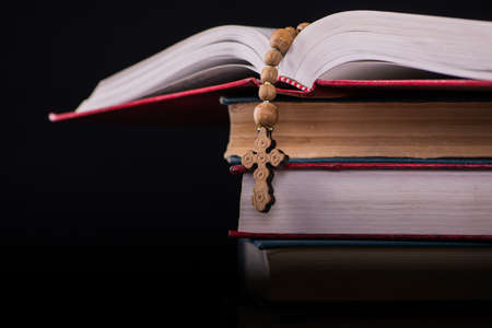 cross standing on book isolate on black background
