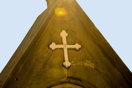Golden crucifix mounted on the church wall. Symbol of Christianity.