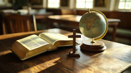 A wooden cross stands beside an open book on a textured surface. The soft lighting highlights the peaceful atmosphere, inviting contemplation and reflection.