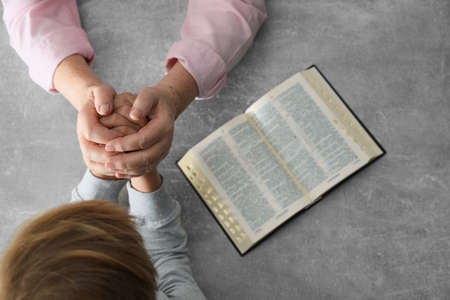 Religious Christian Child praying over Bible indoors, Religious concepts. Religious beliefs Christian life crisis prayer to god.