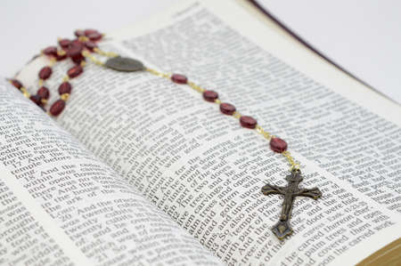 Top view of Bible verses with blurred Holy Rosary Background. Christianity concept
