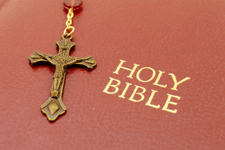 A closeup of a rosary cross and the Holy Bible book title printed in gold foil.