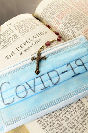 An open Bible and rosary with a mask marked with the pandemic Covid19 as some turn to God for help in trying times.