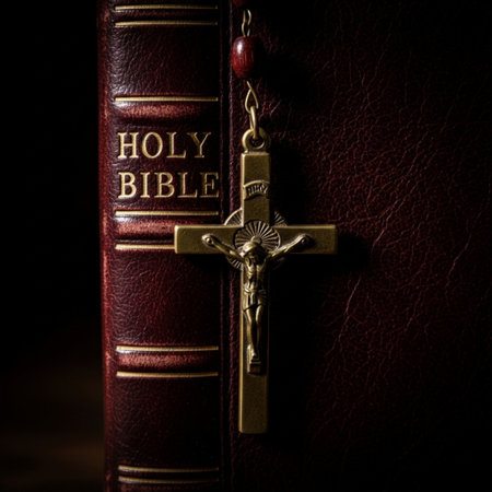A person holds a closed Holy Bible with a Christian cross pendant resting on the cover, symbolizing faith, prayer, and devotion.