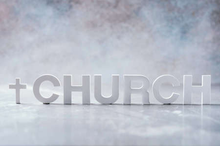 Word Church made with cement letters and cross on grey marble background. Copy space. Biblical, spiritual or christian reminder