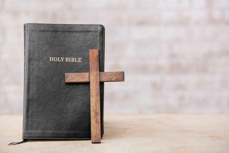 Spirituality, Religion and Hope Concept. Holy Bible and Cross on Desk. Symbol of Humility, Supplication,Believe and Faith for Christian People