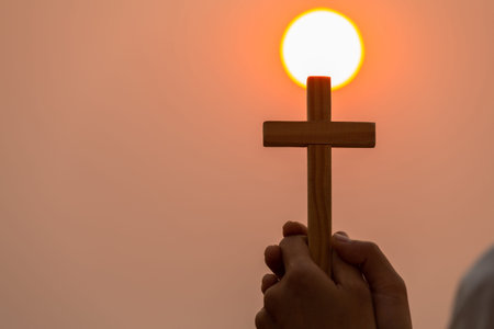 Both hands grasped the cross to pray to God. While the sun is setting or rising Christian religious concepts, the crucifixion of faith and faith in God.