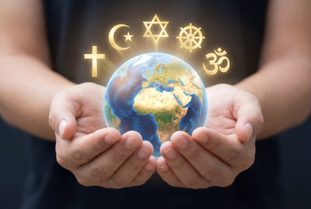 A pair of human hands gently cradles a glowing earth globe with golden symbols of christianity islam judaism buddhism and hinduism floating above, representing global unity and interfaith peace.