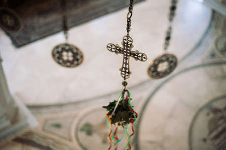 Patterned cross in church close-up. Beautiful interior of temple in style of Byzantine architecture, Barnaul city, 24 july 2017.