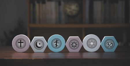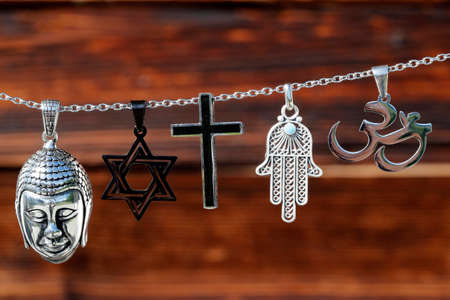 Religious symbols. Christianity, Islam, Judaism, Buddhism and Hinduism. Interfaith dialogue.