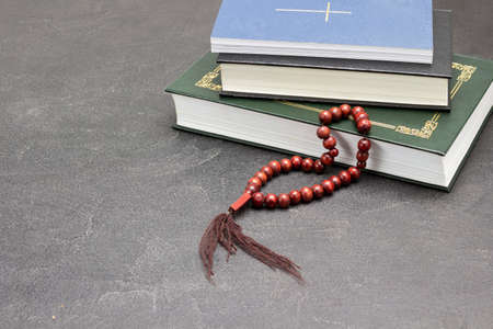 Islamic Book Koran with rosary on background