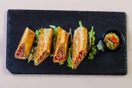 tacos dorados, flautas de pollo, chicken tacos and spicy Salsa Homemade Mexican food in mexico