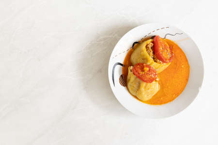 Stuffed pepper with green parsley and spices on a light background in a white plate. The view from the top. Concept of culinary backgrounds.