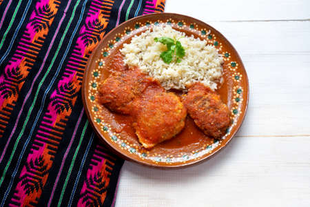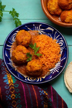 meatballs with red rice and tomato broth on a turquoise background. Traditional mexican food