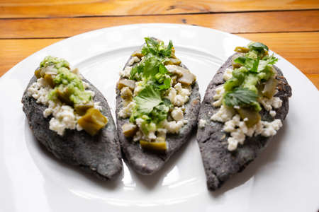 Traditional mexican tlacoyos with green sauce and nopal cactus