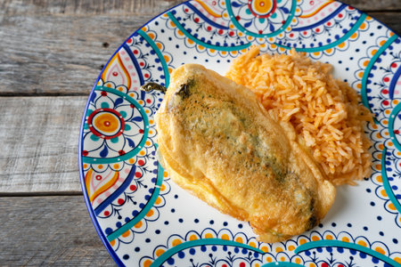 Traditional mexican stuffed chili pepper filled with red rice on wooden background