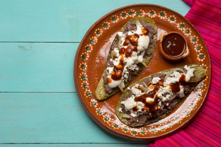 Traditional mexican nopal cactus huaraches with cheese and beans on turquoise background